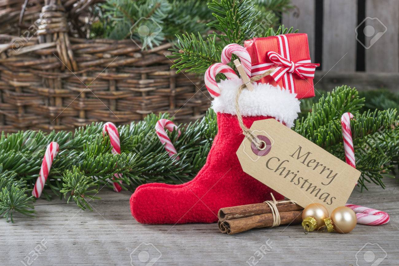 English Christmas Card With Red Sock Gifts Candy Canes And Stock Photo Picture And Royalty Free Image Image